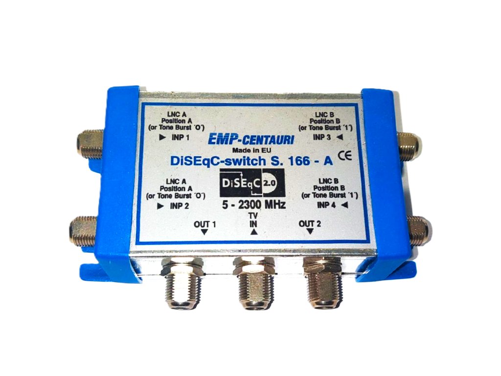Dvojitý DiSEqC 2.0 přepínač 4vstupy/2výstupy pro 2 satelitní pozice a 2 předplatitele (nebo 2 tunery), vybavený slučovači pro pozemní pásmo.