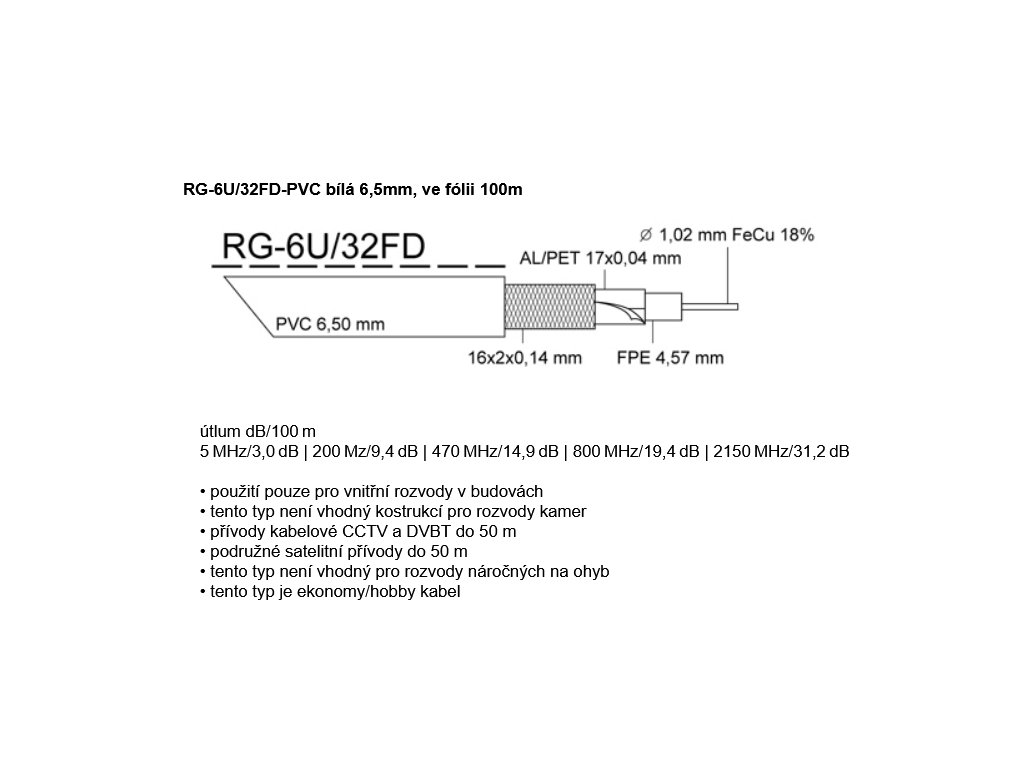 KX92 RG-6U/32FD-PVC bílá 6,5mm, ve fólii 100m