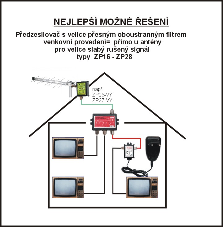 2/ V případě, kdy obrázek není dobrý ani s krátkým svodem a s jednou televizí, je třeba použít předzesilovač.Ten tím, že je určen pro konkrétní pásmo,případně kanál je speciálem a má proto lepší šumové parametry než zesilovače rozvodové (širokopásmové).