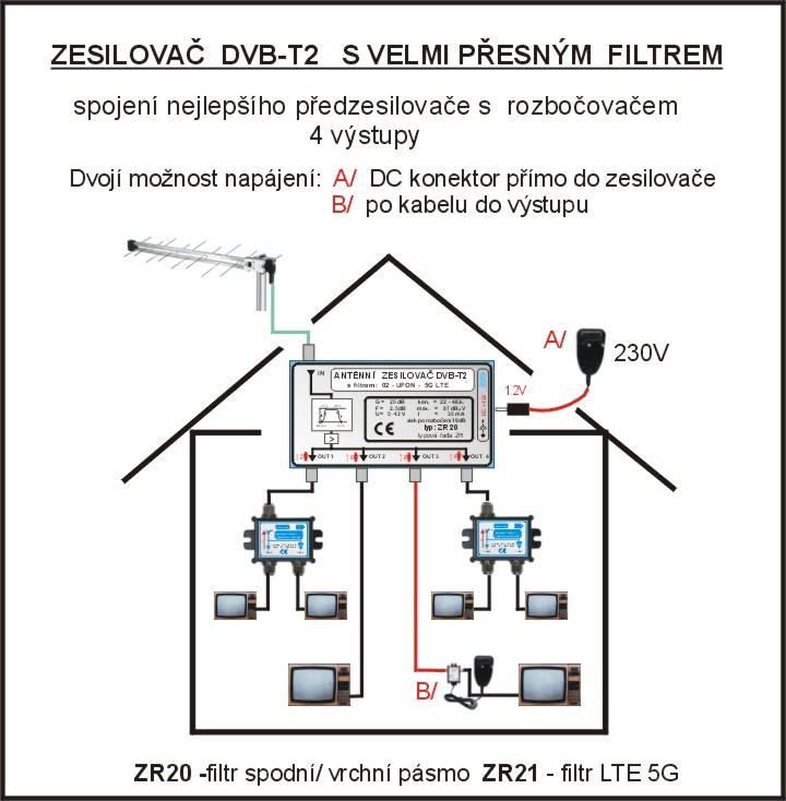 Vznikl spojením našeho nejlepšího předzesilovče s filtry O2+UFON+5G LTE "ZP27" se 4 násobným rozbočovačem