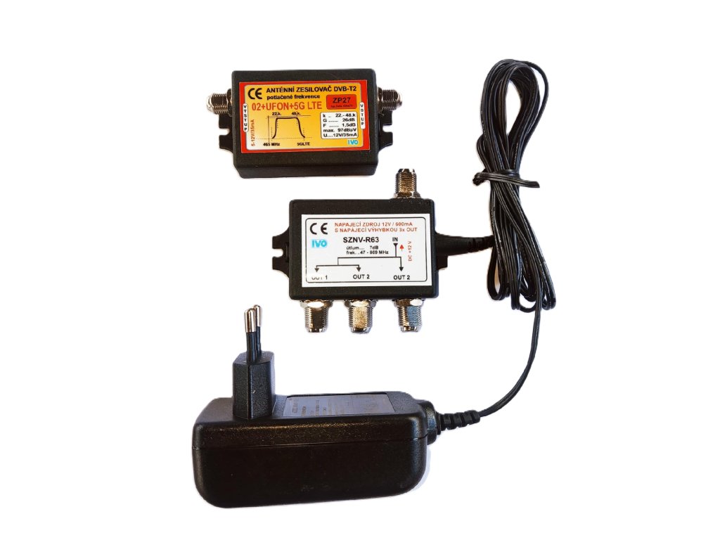 SET: anténní nízkošumový zesilovač 26dB, s filtry: O2,UFON,5G LTE-35dB vnitřní provedení + zdroj s nap. výhybkou se 3 výstupy